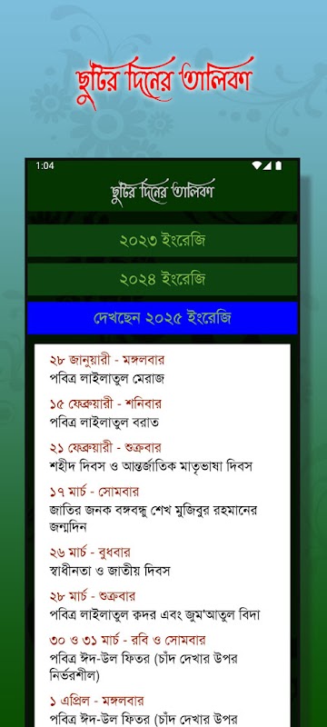 Ta aplikacja kalendarza zawiera kalendarz angielski od 2023 do 2024 i 2025 wraz z kalendarzem bengalskim i arabskim. Podawane są w nim także święta państwowe Bangladeszu. Nie musisz mieć w telefonie komórkowym osobnej aplikacji kalendarza bengalskiego i aplikacji kalendarza arabskiego. Wewnątrz tego angielskiego kalendarza znajdziesz kalendarze bengalskie i arabskie, jest też wieczny harmonogram modlitw i postów, możliwość robienia notatek potrzebnych w dowolnym dniu oraz kompas pozwalający określić kierunek Qibla, niezależnie od tego, gdzie się znajdujesz jesteś w Bangladeszu, możesz łatwo dowiedzieć się, który kierunek jest na zachód, a który to Qibla.
