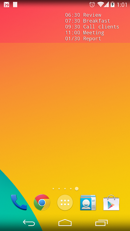 Lubimy Kalendarza Google, ponieważ może być stosowany na wszystkich platformach. Ta aplikacja dodać Kalendarze Google na ekranie. Wyświetla dzisiejsze wydarzenia, dzisiejsza niedokończonych zdarzeń, wydarzeń w ciągu najbliższych 24 godzin, wydarzeń w ciągu najbliższych 3 miesięcy. Jest to wysoce konfigurowalny. Można dostosować wielkość rodziny kolor / czcionki / font / szerokość / przejrzystość / stanowiska / kolor dla kalendarza.