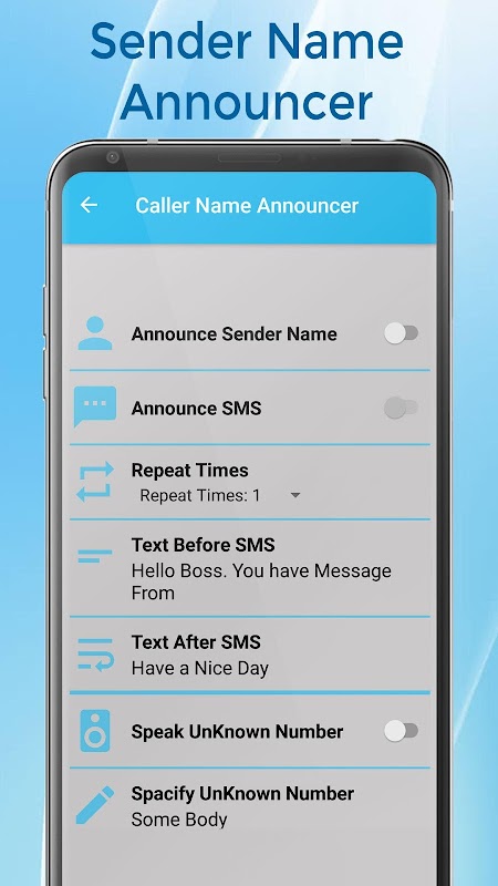 ✔ Enable or Disable Caller Name Announcer, SMS sender name and SMS contents reading