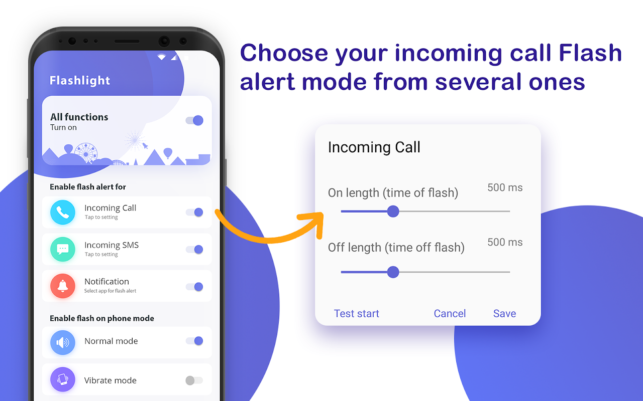 Then this flashlight alert app - call flash light app will be a perfect option for you. The flashlight alert will start to blink on the arrival of calls, SMS and notifications. This Calling flashlight: Flash blinking on call app also let you to set the amounts and time for the flashlight alert, flashlight ringtone even if your mobile is on silent and vibration.