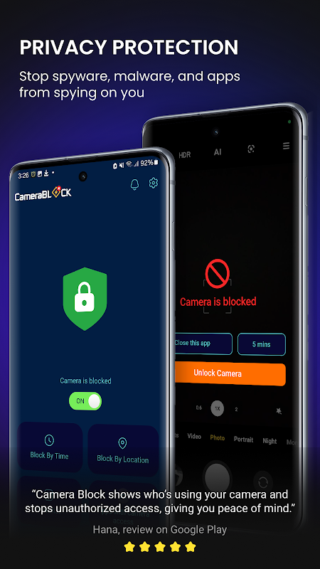 Wystarczy jedno kliknięcie, aby kamera w telefonie była w pełni chroniona i blokowana przed aplikacjami monitorującymi.