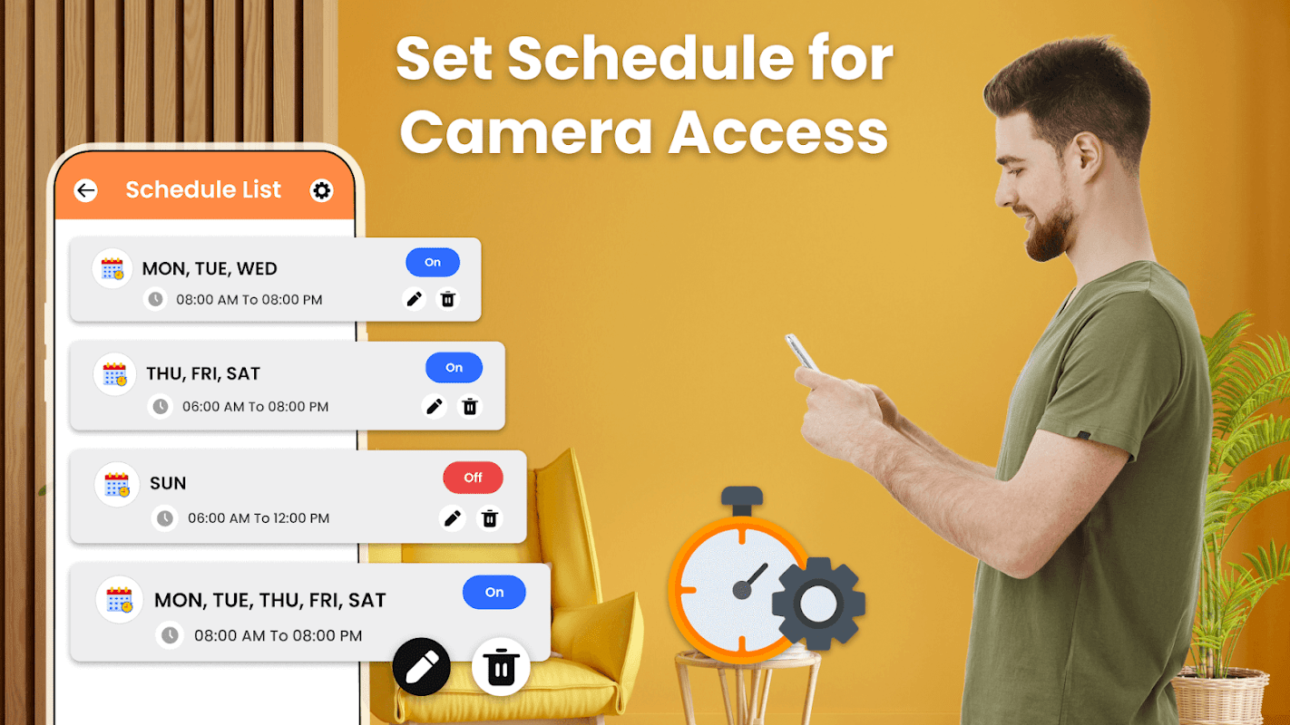 Dodatkowo, jeśli chcesz zaplanować blokowanie kamer na określone godziny, aplikacja oferuje funkcję planowania. Możesz wybrać dni oraz ustawić godziny rozpoczęcia i zakończenia, aby automatycznie wyłączać kamerę w tych okresach, zapewniając ochronę przed nieautoryzowanym dostępem.
