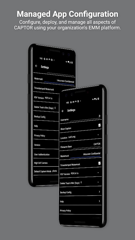 WAŻNE: CAPTOR™ to aplikacja Android Enterprise AppConfig przeznaczona do stosowania jako aplikacja zarządzana wdrażana przez platformę zarządzania mobilnością przedsiębiorstwa (EMM), taką jak VMware Workspace ONE (AirWatch), AppTec360, Citrix Endpoint Manager. CAPTOR wymaga klucza licencyjnego firmy Inkscreen. Przejdź na stronę www.inkscreen.com/trial, aby poprosić o klucz licencyjny.
