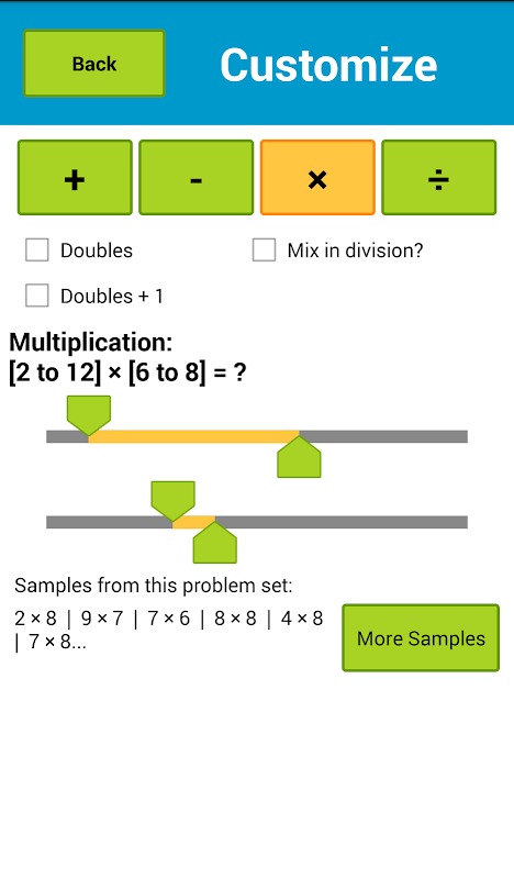 Łatwy do uruchomienia + w pełni konfigurowalny, gdy jest potrzebny. W przeciwieństwie do większości aplikacji, możesz ustawić dokładnie to, czego potrzebuje Twoje dziecko (np. Pomnożenie przez 7 i 8, na przykład). Teraz z 10 standardowymi zestawami problemów standardowych, które pasują do tego, czego uczą się w szkole.