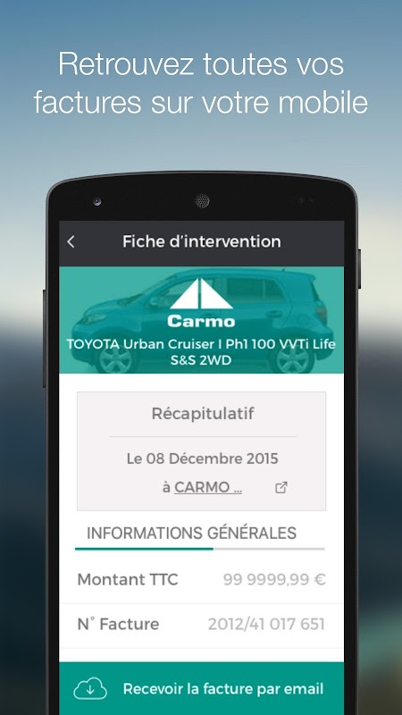 CARMO, l’application Espace Client de votre concession automobile. Un accès simple et sécurisé pour prendre un rendez-vous atelier en ligne, suivre l’état des travaux relatifs à un rendez-vous en cours, accéder aux informations techniques de votre véhicule, consulter l’historique de votre suivi après-vente, recevoir vos factures sous format PDF, contacter votre concession et les services d’assistance.