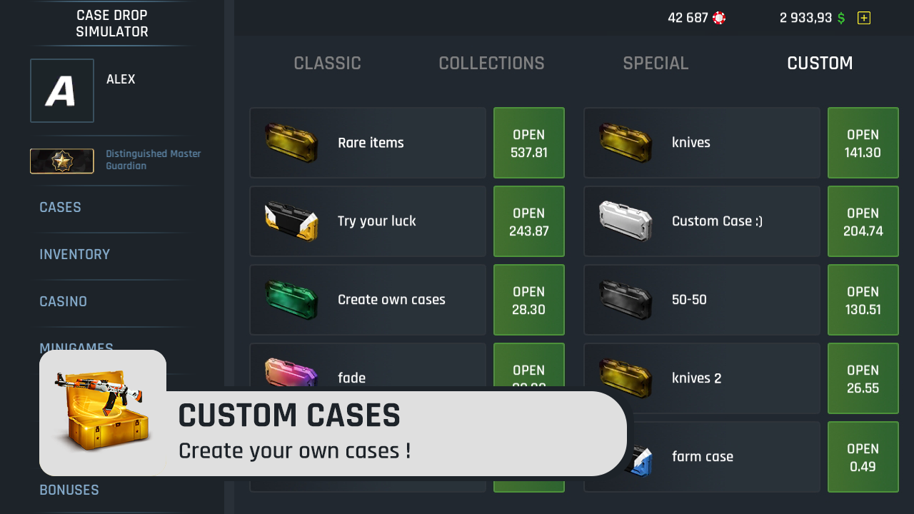 Uwaga: Case Drop Simulator to po prostu mobilna aplikacja do symulacji i nie jest powiązana z Counter Strike: Global Offensive lub CS 1.6, więc wszystkie znalezione tam skórki i inne przedmioty NIE MOGĄ być używane na Steamie lub oficjalnej grze Valve.