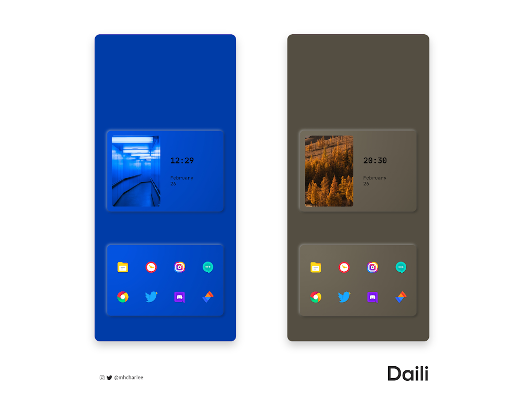 Daili: Zainspirowany neumorfizmem. Kolorystyka i obrazy zmieniają się 4 razy dziennie.
