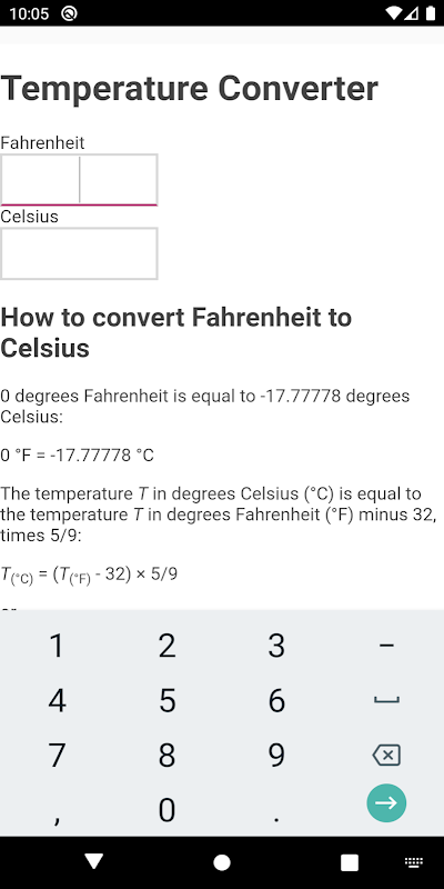 Prosty program, który oprócz przeliczania jednostek temperatury z Fahrenheita na Celsjusza i odwrotnie, uczy również, jak użytkownik może wykonać to zadanie. Ta aplikacja działa offiline.