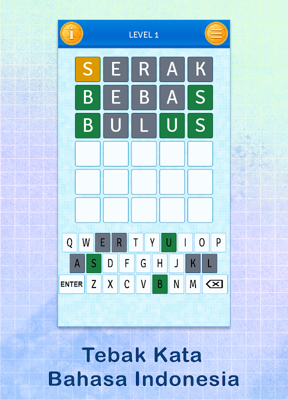 1. Pierwszy krok, odgadnij słowo. Wpisz 5-literowe słowo, a następnie naciśnij ENTER. o tak, wpisywane słowo musi znajdować się w słowniku (KBBI).