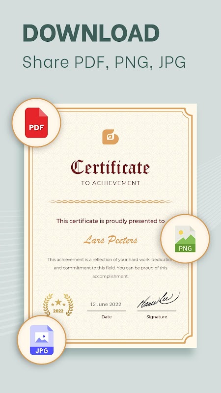 Szablony certyfikatów i aplikacja do edycji ułatwiły natychmiastowe tworzenie pięknych profesjonalnych certyfikatów bez żadnego doświadczenia w projektowaniu. Korzystając z tej aplikacji, nie będzie potrzeby zatrudniania żadnego profesjonalnego projektanta do wykonania certyfikatu do druku. Certyfikat możesz zaprojektować za pomocą smartfona.