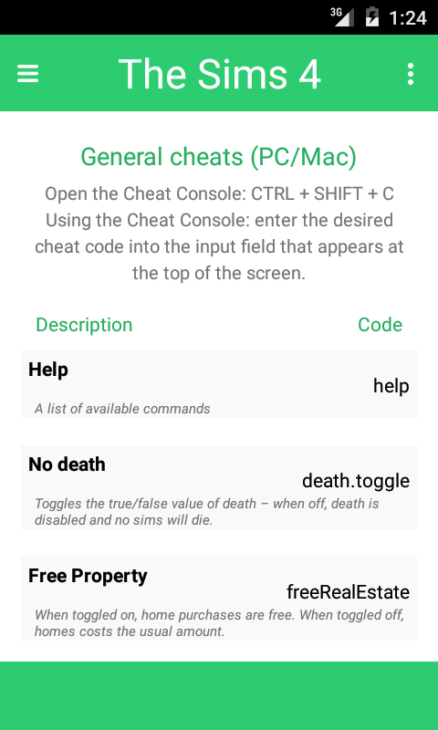 Cheat codes for the Sims includes all the newest cheats for the Sims. All the cheats are easily accessed on your phone, anytime, since the app doesn't require internet to work. The cheats have been conveniently sorted into categories, so any cheat can easily be found.