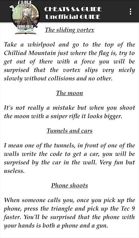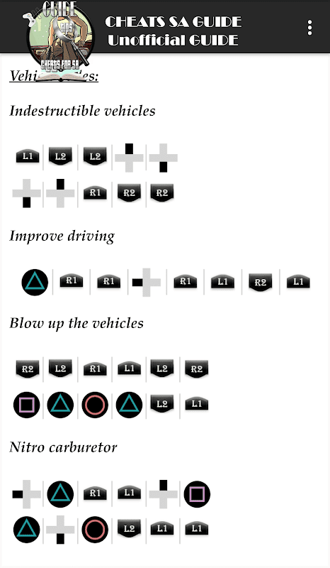 Cheats For SA (Unofficial Guide) is a very simple and reliable application that contains the best codes and tips for SA.