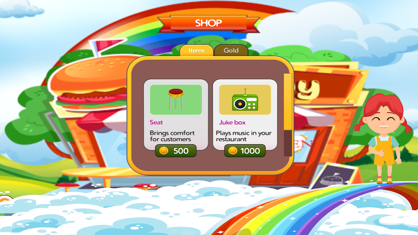 Make a fortune preparing the burgers and furnish your restaurant from the virtual shop. You can buy candies so that your customers (ruby 's friends) stay longer in the game or decorate the chef ruby game with chairs and flowers for ruby friends to give more tips.