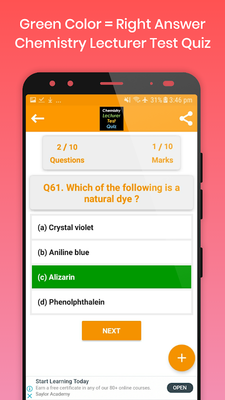 The app will help you in all kind of exams, tests and interviews. It will help you in MCQs-type Tests, Quiz-type interviews etc. The app covers almost all topics of chemistry at a moderate level.