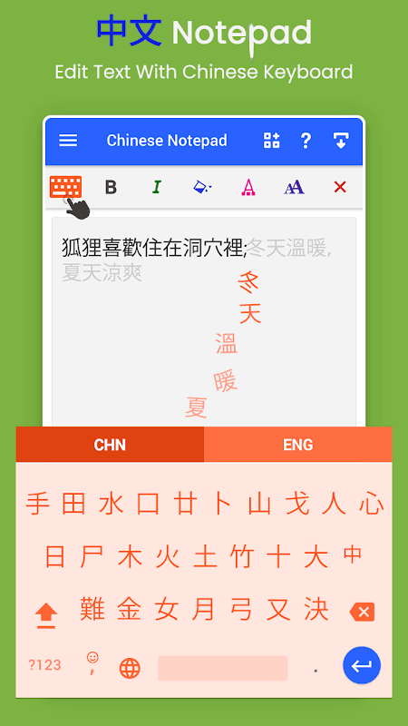 Take your notes faster and easy in Chinese with Chinese Keyboard to take your note in Chinese.