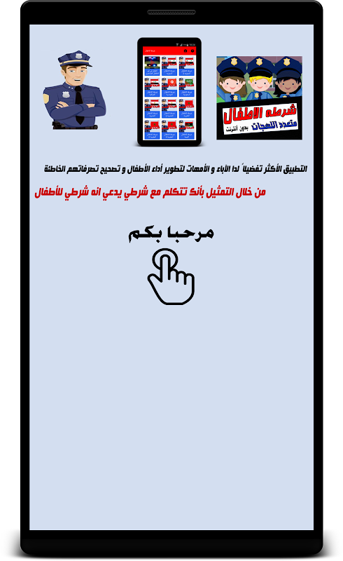 تطبيق بوليس بدون انترنت هو برنامج مهم جدا لكل الآباء و الأمهات لتصحيح تصرفات الاطفال الخاطئة من خلال التمثيل بأنك تتكلم مع شرطة الاطفال، والتي تخوف الطفل اذا لم يسكت ويمكنك ايضا من الاختيار بين عدة حالات و بمختلف اللهجات .