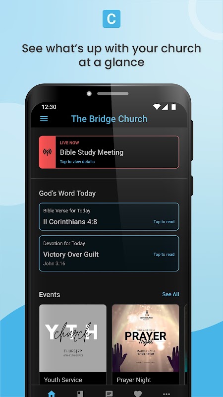 Dzięki Churchee możesz otrzymywać powiadomienia o transmisjach na żywo ze swoich ulubionych kościołów. Zobaczysz również ich plany wydarzeń i zsynchronizujesz je ze swoimi kalendarzami.