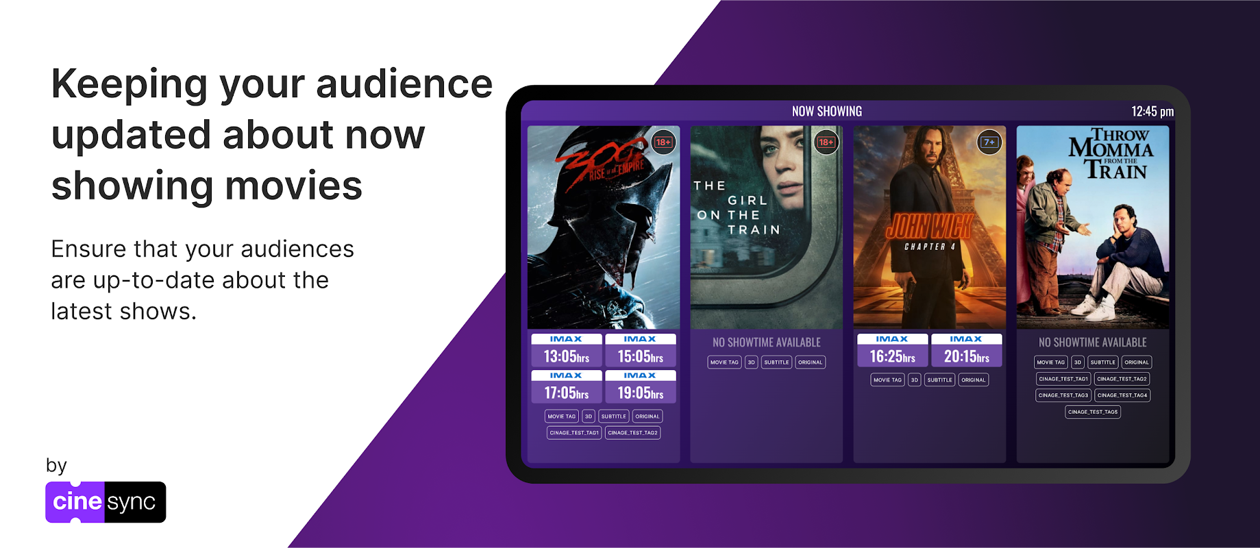 CINEsign to przyjazna dla użytkownika platforma Digital Signage, która bezproblemowo integruje się z oprogramowaniem kinowym CINEsync. Dzięki CINEsign Twoje filmy, wydarzenia i godziny seansów są automatycznie synchronizowane z niestandardowymi listami odtwarzania. Platforma działa niezależnie, nie wymaga łączności i zapewnia spójne i wciągające wrażenia dla Twoich klientów, jednocześnie usprawniając procesy dla personelu Twojego kina.