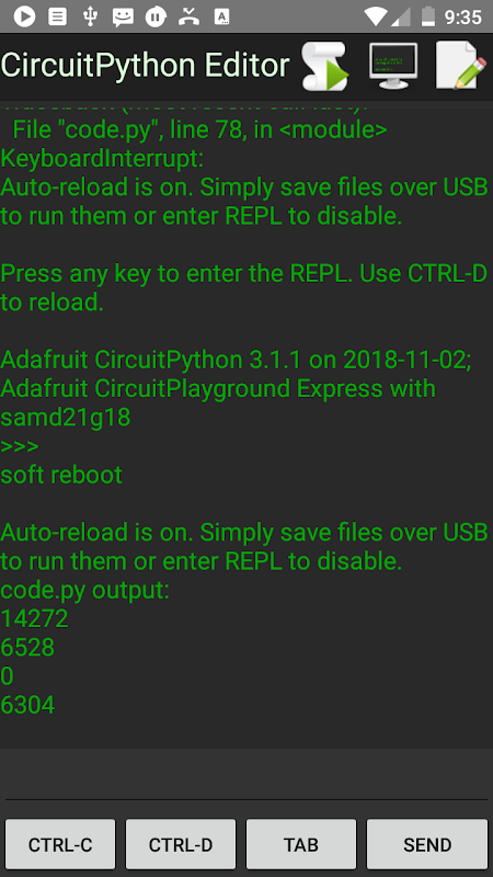 Użyj USB Serial do komunikacji z płytkami Circuit Python. Możesz go użyć, aby zobaczyć wyjścia print () do debugowania, lub wprowadź REPL, aby wykonać polecenia Pythona na płycie. Korzystając z REPL możemy odczytać i napisać plik code.py oraz inne pliki przechowywane na płycie, które byłyby niedostępne z powodu niezgodności przechowywania plików w systemie Android.