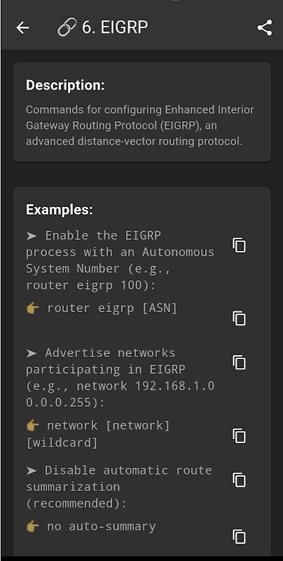 📋 Łatwe kopiowanie: jednym dotknięciem kopiuj złożone polecenia bezpośrednio do schowka urządzenia. Idealne do ćwiczeń w symulatorach lub laboratoriach wirtualnych.