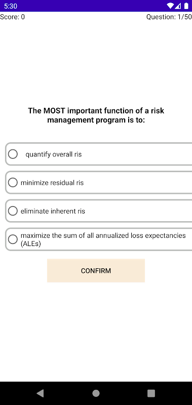 Przygotuj się do egzaminu certyfikacyjnego CISM (Certified Information Security Manager), korzystając z aplikacji na Androida z pytaniami egzaminacyjnymi CISM. Ta wszechstronna aplikacja do symulacji nauki i egzaminów została zaprojektowana, aby pomóc Ci opanować treść egzaminu CISM i zwiększyć Twoje szanse na sukces. Należy pamiętać, że ta aplikacja została opracowana niezależnie i nie jest powiązana z ISACA ani żadnymi organizacjami zewnętrznymi.