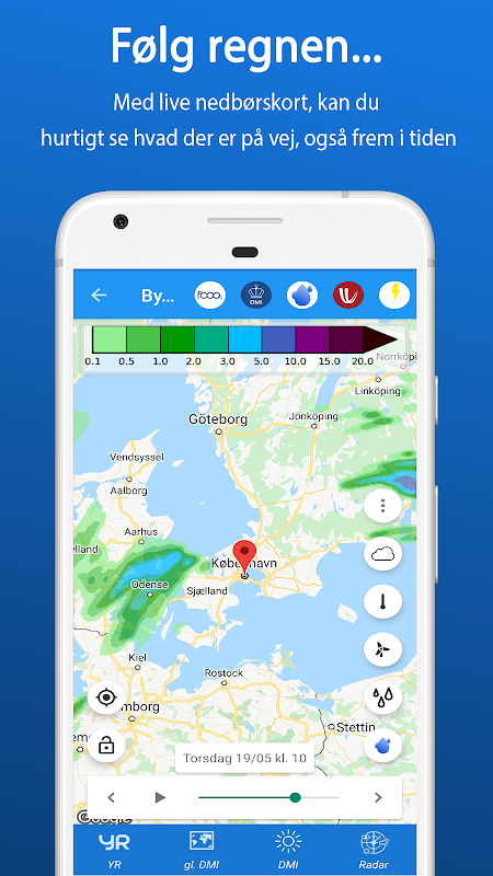 ByVejr pobiera dane pogodowe z DMI i YR, dzięki czemu możesz łatwo porównać oba serwisy pogodowe i stworzyć najlepszy przegląd tego, jaka będzie pogoda.