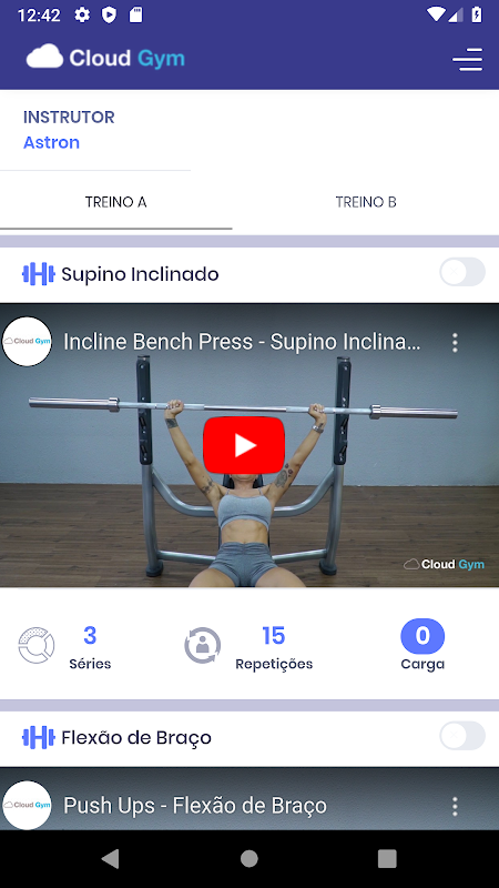 • Ficha de treino com vídeos de como executar o exercício.
