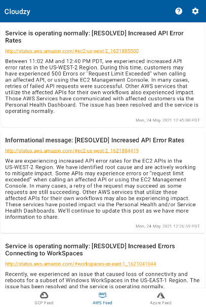 Cloudzy is a free and open-source app that gets you the latest alerts for major cloud providers and displays them in an easy-to-read manner. We provide tailored notifications for the cloud providers you care about the most.