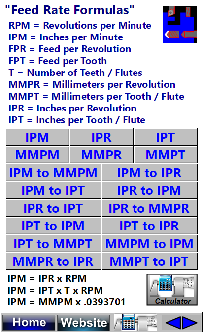 Formulas & Calculators for Machinists, CNC Programmers,Tool Makers, Metalworking Engineers, Machinist Apprentices, Conventional Machinists, Manual Machinists, Hobby Machinists, Machine Shops, CNC Turning, CNC Milling, CNC Mill Operators, CNC Lathe Operators, CNC Mill Set-Up, CNC Lathe Set-Up, Machine Shop Inspection, Compound Sine Plate Set-Up. Cutting Speed Formulas, Angles & Degrees Formulas, Drill Tip Formulas, Feed Rate Formulas, Metal Removal Formulas, Rotary Axis Formulas, Tapping Formulas, True Position Formula. Formulas include: Surface Feet per Minute SFM, Surface Meters per Minute SMPM, Revolutions per Minute RPM, Degrees to Radians, Radians to Degrees, Decimal to Degrees, Degrees to Decimal, Sharp Drill Tip Length Formulas, Flat Drill Tip Length Formulas, Feed Rate Formulas & Calculators: Inches per Minute, Inches per Revolution, Inches per Tooth, Millimeters per Minute, Millimeters per Revolution, Millimeters per Tooth, Inches per Minute to Millimeters per Minute, Inches per Minute to Inches per Revolution, Inches per Minute to Inches per Tooth, Inches per Revolution to Inches per Minute, Inches per Revolution to Inches per Tooth, Inches per Revolution to Millimeters per Revolution, Inches per Tooth to Inches per Minute, Inches per Tooth to Inches per Revolution, Inches per Tooth to Millimeters per Tooth, Millimeters per Minute to Inches per Minute, Millimeters per Revolution to Inches per Revolution, Millimeters per Tooth to Inches per Tooth. Metal Removal Formulas & Calculators: Time Cutting in Minutes TCM, Time Cutting in Seconds TCS, Distance over Time in Minutes, Metal Removal Rate MRR. Rotary Axis Formulas & Calculators : Inches per Minute to Degrees per Minute, Millimeters per Minute to Degrees per Minute, Degrees per Minute to Inches per Minute, Degrees per Minute to Millimeters per Minute. Tapping Formulas & Calculators: Tapping Feed Rate in Inches per Revolution, Tapping Feed Rate in Millimeters per Revolution, Tapping Feed Rate in Inches per Minute, Tapping Feed Rate in Millimeters per Minute, Tapping Feed Rate for Inch Taps on a Metric Machine, Tapping Feed Rate for Metric Taps on a Inch Machine, Tap Drill Size Formula for Inch Cutting Taps, Tap Drill Size Formula for Inch Roll Form Taps, Tap Drill Size Formula for Metric Cutting Taps, Tap Drill Size Formula for Metric Roll Form Taps. Inspection Formulas: Sine Plate Set-Up Formula & Calculator, Compound Sine Plate Set-Up Formula & Calculator, True Position Formulas & Calculator with or without Maximum Material Condition MMC