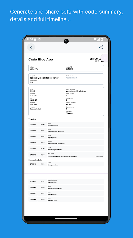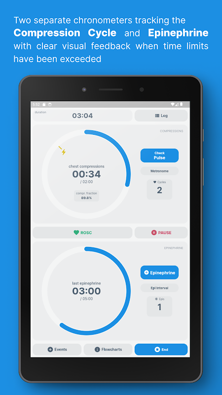 Timer Code Blue CPR został opracowany i szeroko przetestowany, aby dostarczać kluczowych informacji w precyzyjny i intuicyjny sposób, pomagając w jednym z najbardziej stresujących i krytycznych czasowo zdarzeń w środowisku opieki zdrowotnej. Układ timera został starannie zaprojektowany, aby śledzić i rejestrować ważne zdarzenia (np. rytm początkowego zatrzymania krążenia, sprawdzenie tętna/rytmu, leki, procedury itp.), z dwoma oddzielnymi chronometrami, które umożliwiają monitorowanie obu cykli uciskania klatki piersiowej i jednocześnie dawki epinefryny.