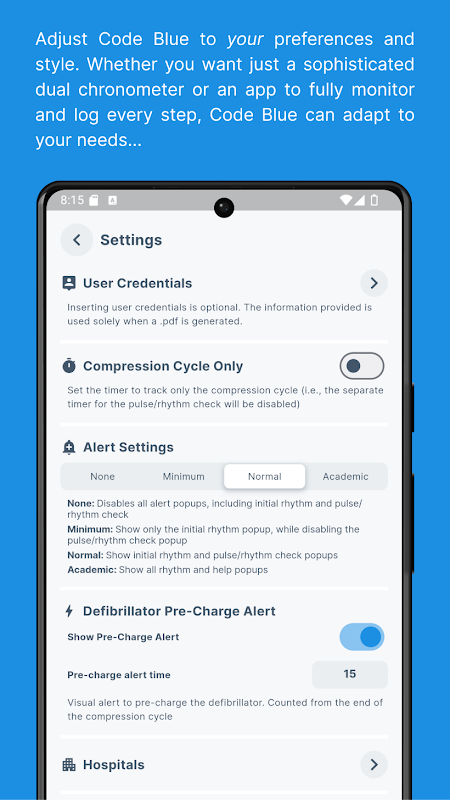 🔹 ⚙️Wiele ustawień: niezależnie od tego, czy wolisz prosty minutnik do resuscytacji krążeniowo-oddechowej z dwoma chronometrami, czy w pełni funkcjonalną aplikację, która pozwala zachować precyzyjną kontrolę nad długimi i złożonymi zdarzeniami zatrzymania krążenia, które mogą trwać godzinami, Code Blue można dostosować do pasuje do Twoich potrzeb