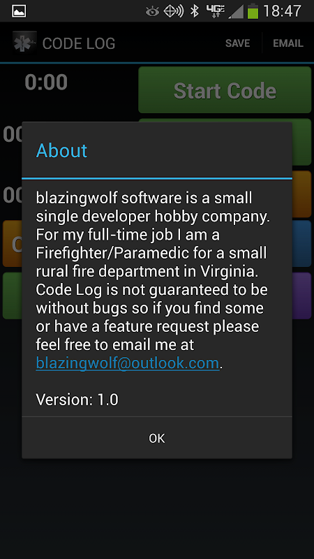 Code Log is a logging program that you can use to help remember the exact times that you performed all of the steps in your code. It gives you a chronograph to show how long the code was run. It timestamps your drugs given, events, rhythms and return of pulse. Code Log allows you to email the timestamps using your favorite email application. You can also save the log to your device so that you can look at it later (it will be saved to your root of your SD-Card). It can be used for more than just codes. You can use it to get real times on any call that you run.