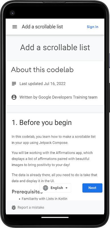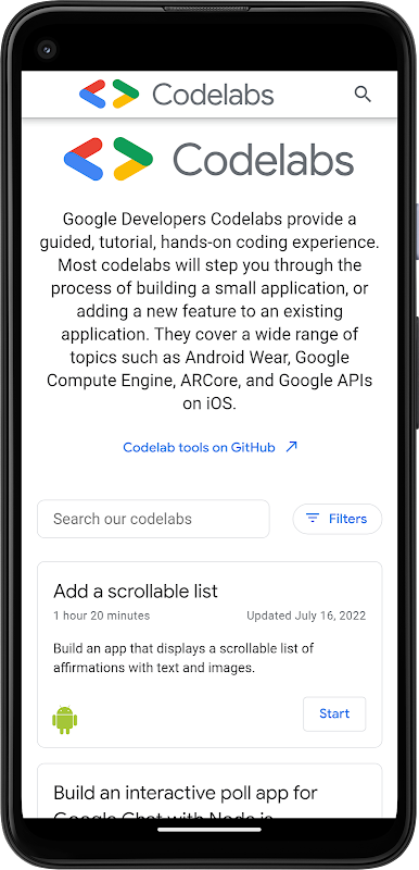 Ćwiczenia z programowania: Twórz wszystko, co zapewnia przewodnik, samouczek i praktyczne doświadczenie kodowania. Większość ćwiczeń z programowania przeprowadzi Cię przez proces tworzenia małej aplikacji lub dodawania nowej funkcji do istniejącej aplikacji. Obejmują one szeroki zakres tematów, takich jak Android Wear, G Compute Engine, ARCore i interfejsy API G na iOS.