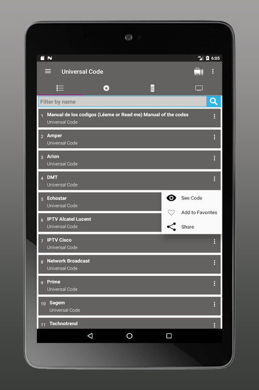 Los códigos del controlador remoto de tv universal esta app te permite seleccionar rápidamente miles de códigos de fabricantes de tv para que pueda configurar su mando o (control) para la televisión.