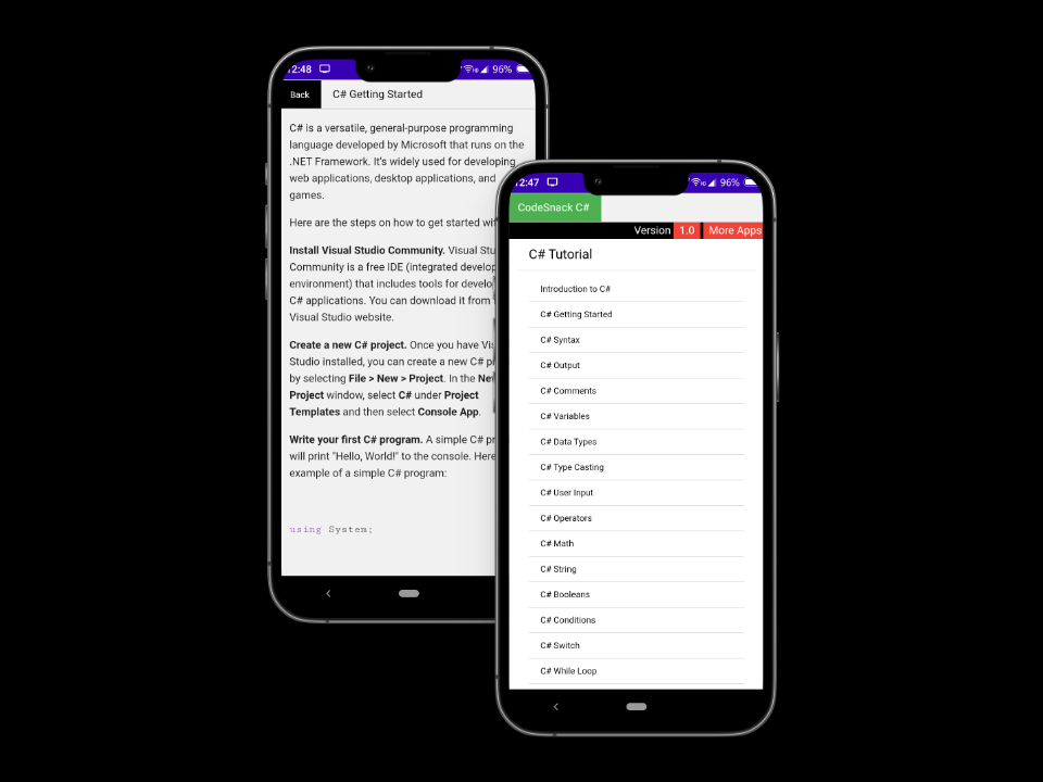 Witamy w „CodeSnack C#”, gdzie rozpoczyna się Twoja podróż do opanowania języka programowania C#. Niezależnie od tego, czy jesteś nowicjuszem w programowaniu, czy chcesz udoskonalić swoje umiejętności, ta aplikacja została zaprojektowana tak, aby być Twoim ulubionym towarzyszem w zostaniu biegłym programistą C#.
