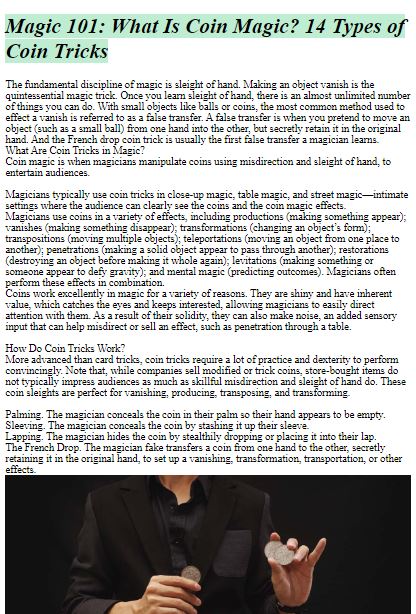 Magia monet to urzekająca forma magii z bliska, która opiera się na zręczności, wprowadzaniu w błąd i sztuczkach rąk, aby stworzyć zdumiewające iluzje. Niezależnie od tego, czy jesteś początkującym, który chce nauczyć się podstaw, czy doświadczonym magikiem chcącym poszerzyć swój repertuar, ten obszerny samouczek poprowadzi Cię przez podstawowe sztuczki związane z magią monet. Od klasycznych zniknięć i transformacji po złożone procedury i rozkwity – odkryjesz sekrety wykonywania hipnotyzującej magii monet, która oczaruje twoją publiczność.