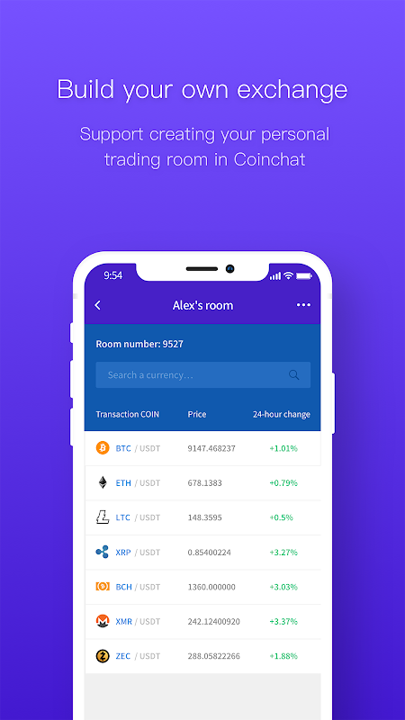 3.Trading pokój. Coinchat zapewnia szybką i skuteczną funkcję transakcyjną, która pozwala użytkownikom na tworzenie swoich pokoi handlowych za pomocą kryptowaluta. Właściciele pomieszczeń handlowych można uzyskać handel prowizja od każdej transakcji.