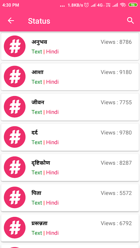 Ta aplikacja ma kolekcje ponad 10 000 000 statusów, cytatów, powiedzeń, nastrojów, żartów, Ghazals, statusu, opowiadań, Sher, Ghazals, pozdrowienia i wiele więcej. w hindi i angielskim. które możesz udostępnić znajomym na WhatsApp, Facebooku i innych mediach społecznościowych.