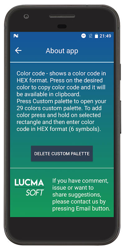 Aplikacja wyświetla kolory i umożliwia kopiowanie kodów kolorów w formatach HEX, RGB, HSV, CMYK i HSL.