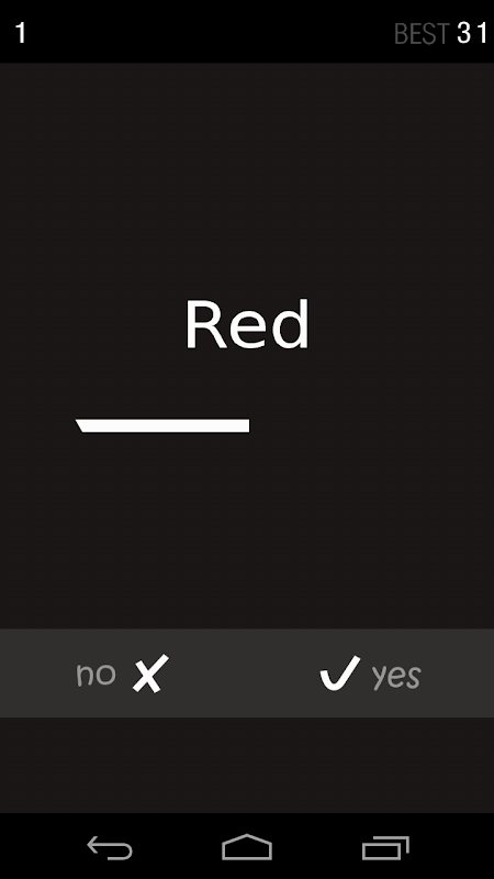Does the color match the text? You should make the right choice based on what you see in a short time. Be careful when the color not match the text.Believe me, this game will drive you crazy and you just cant stop playing it.Try to see where is your best!