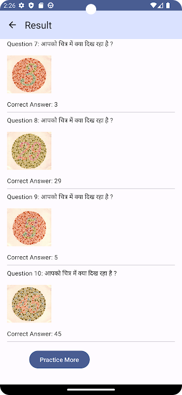 W tej aplikacji Ishihara Test przedstawia serię płytek zawierających kropki ułożone w różnych kolorach i rozmiarach. Osoby z normalnym widzeniem kolorów rozpoznają liczby lub wzory na tablicach i wybiorą właściwą opcję.