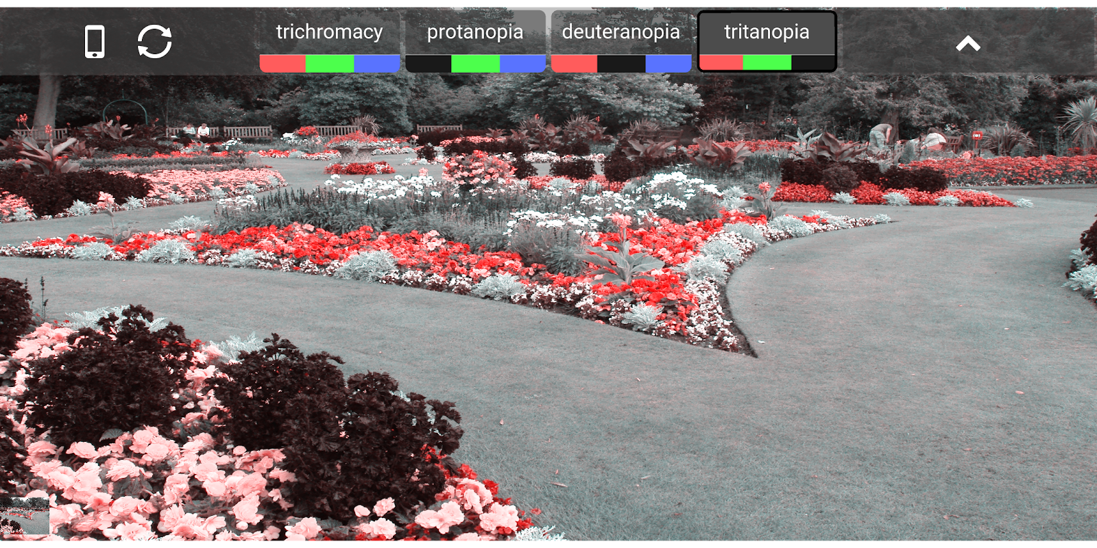 Transformacje kolorów są stosowane bezpośrednio do strumienia kamery. Przełączaj się między różnymi trybami ślepoty barw, aby zobaczyć, których kolorów nie można już odróżnić.