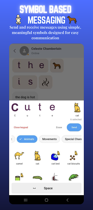 CommUnity wykorzystuje bazę danych symboli Mulberry, solidną i rozpoznawalną bibliotekę reprezentacji wizualnych, do automatycznego tłumaczenia wiadomości tekstowych na symbole. Po otrzymaniu wiadomości — na przykład: „Chodźmy do babci o 15:00!” — aplikacja natychmiast konwertuje ją na sekwencję odpowiadających jej symboli, pomagając użytkownikom niewerbalnym lub początkującym w czytaniu i pisaniu zinterpretować znaczenie wizualnie.