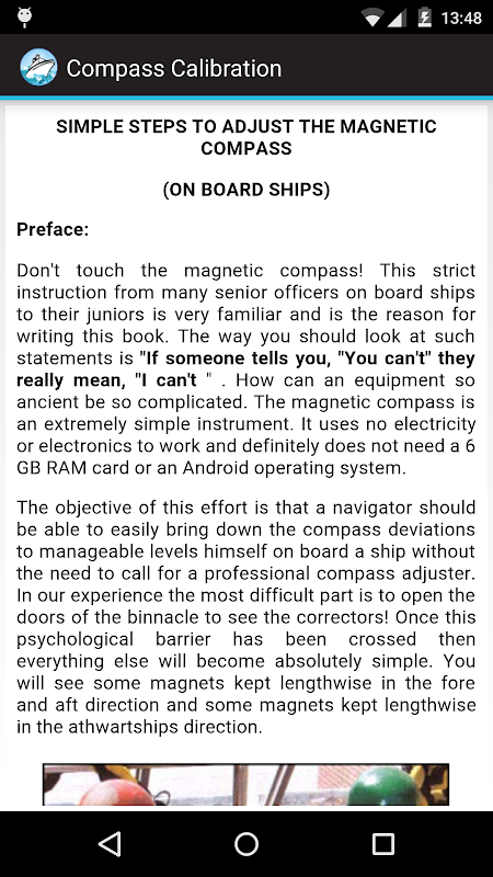 The author of this book Capt. Sanjiv Verma had personal experience when his vessels Magnetic compass had a large error and he successfully followed the suggestion herein to minimise the compass error to approved levels