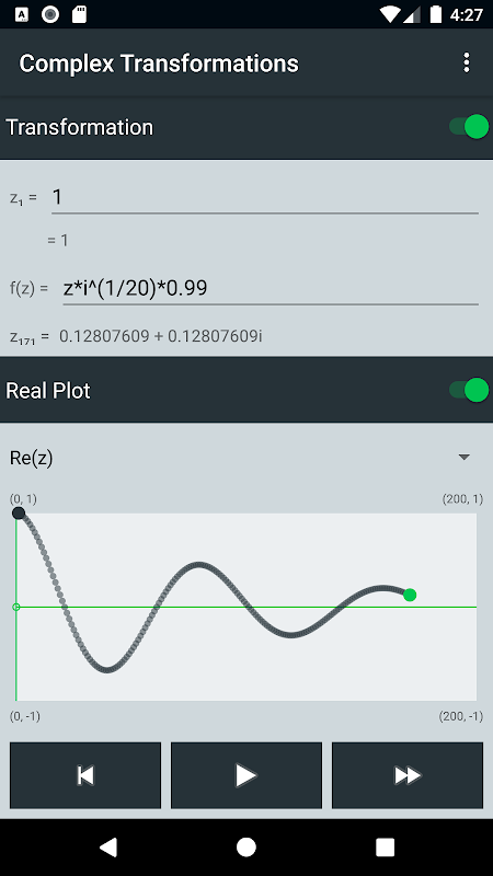 Wykresy rzeczywiste i złożone zapewniają dodatkowe wizualne informacje zwrotne podczas stosowania transformacji. Wykres rzeczywisty może wyświetlać Re (z), Im (z), Mod (z) lub Arg (z). Wykres złożony wyświetla wartości z na diagramie Argand. Możesz zmienić rzeczywisty tryb wydruku w dowolnym punkcie, co pozwala wyraźnie zobaczyć, jak wartości zmieniają się w czasie. Wykresy sprawiają, że aplikacja jest nieocenionym narzędziem do zrozumienia wpływu transformacji na poszczególne wartości z.