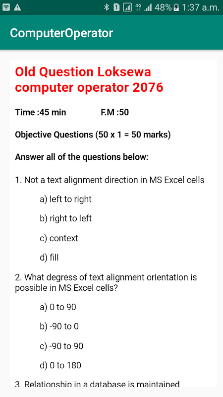 This application contains the Loksewa Computer Operator's syllabus, MCQs (Multiple Choice Questions) and some important hints according to the syllabus. This application also contains the old questions of previous examinations. Here, In this application you will get 400 - 500 VVI MCQs from each subjects. MCQs from the subject Computer Fundamental, Word Processing, Electronic Spreadsheet, Presentation System, Database System, Web Page Design and Operating System are included in this application. The MCQs and hints are very useful for the competitors to study as they are presented in so convenient way. I hope you will find it very useful. seeking for your feedback.