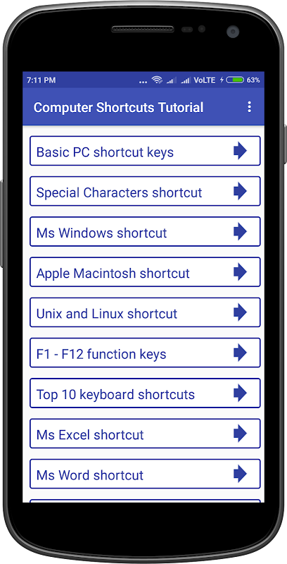 Computer Shortcuts Tutorial app collections of Categories are below and provide all this Topic