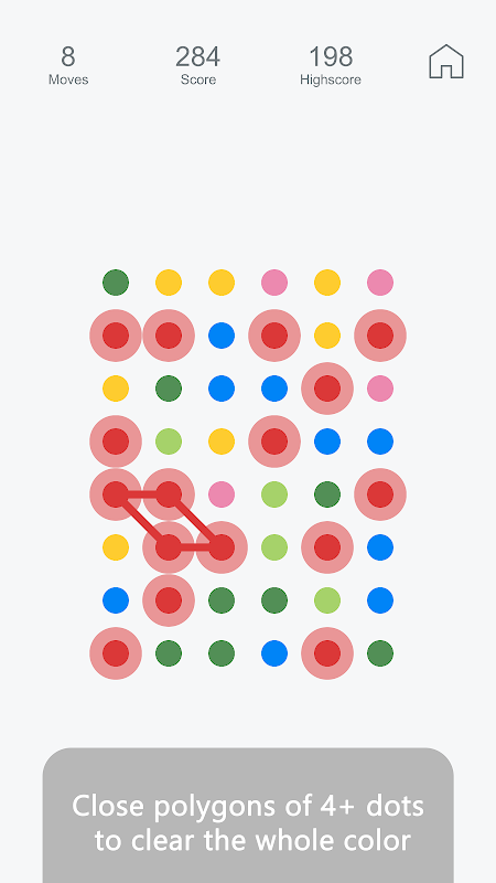 Zbieraj punkty, łącząc ze sobą kropki tego samego koloru. Każda kropka w połączonej linii daje jeden punkt. Na początku gry masz 20 ruchów. Aby uzyskać więcej ruchów, połącz cztery lub więcej kropek w zamknięty wielokąt. Każda kropka w wielokącie to jeden ruch. Gra kończy się, gdy zabraknie ruchów. Nie martw się, zawsze możesz zacząć od nowa, używając przycisku Uruchom ponownie.