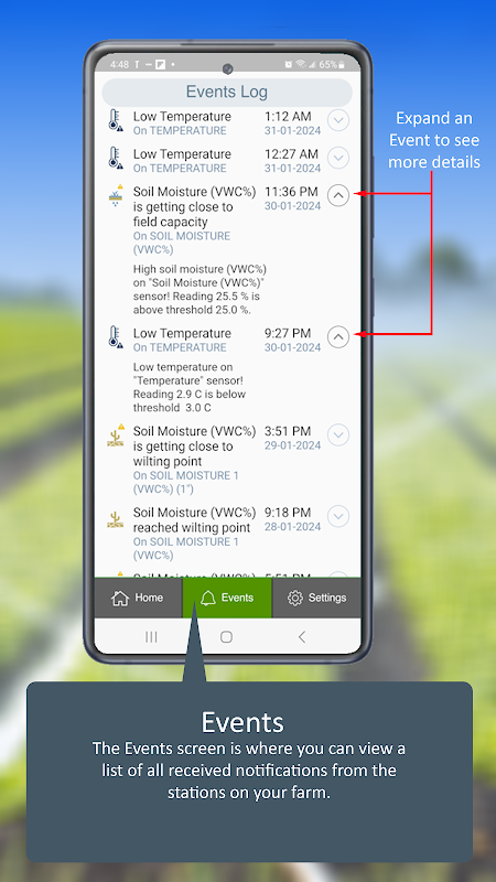 Aplikacja, oparta na platformie IoT firmy Esprida, umożliwia rolnikowi otrzymywanie aktualnych odczytów czujników i zdarzeń w dowolnym miejscu i czasie na swoim iPhonie. Dzięki 4 portom czujników rolnicy mogą podłączyć dowolną kombinację czujników temperatury i wilgotności gleby, aby precyzyjnie monitorować warunki w gospodarstwie. Rolnicy mogą ustawić progi ostrzeżeń i błędów dla wszystkich czujników, a po osiągnięciu progów otrzymywać powiadomienia SMS/e-mail oraz prognozę pogody. Rolnicy mogą otrzymywać miesięczne raporty w formatach PDF i Excel zawierające miesięczne dane z czujników, a także mogą pobierać dane z czujników na żądanie bezpośrednio przez swoje telefony. Te dane Excel można następnie wykorzystać do przeprowadzenia dodatkowej analizy danych z czujników lub połączyć z innymi danymi zebranymi przez rolnika.