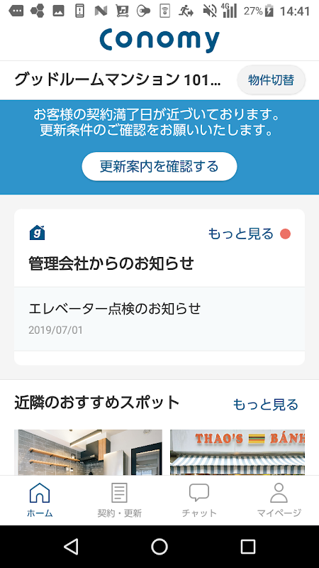更新時期が近づくと、管理会社様よりアプリ内のメッセージにて通知が届きます。